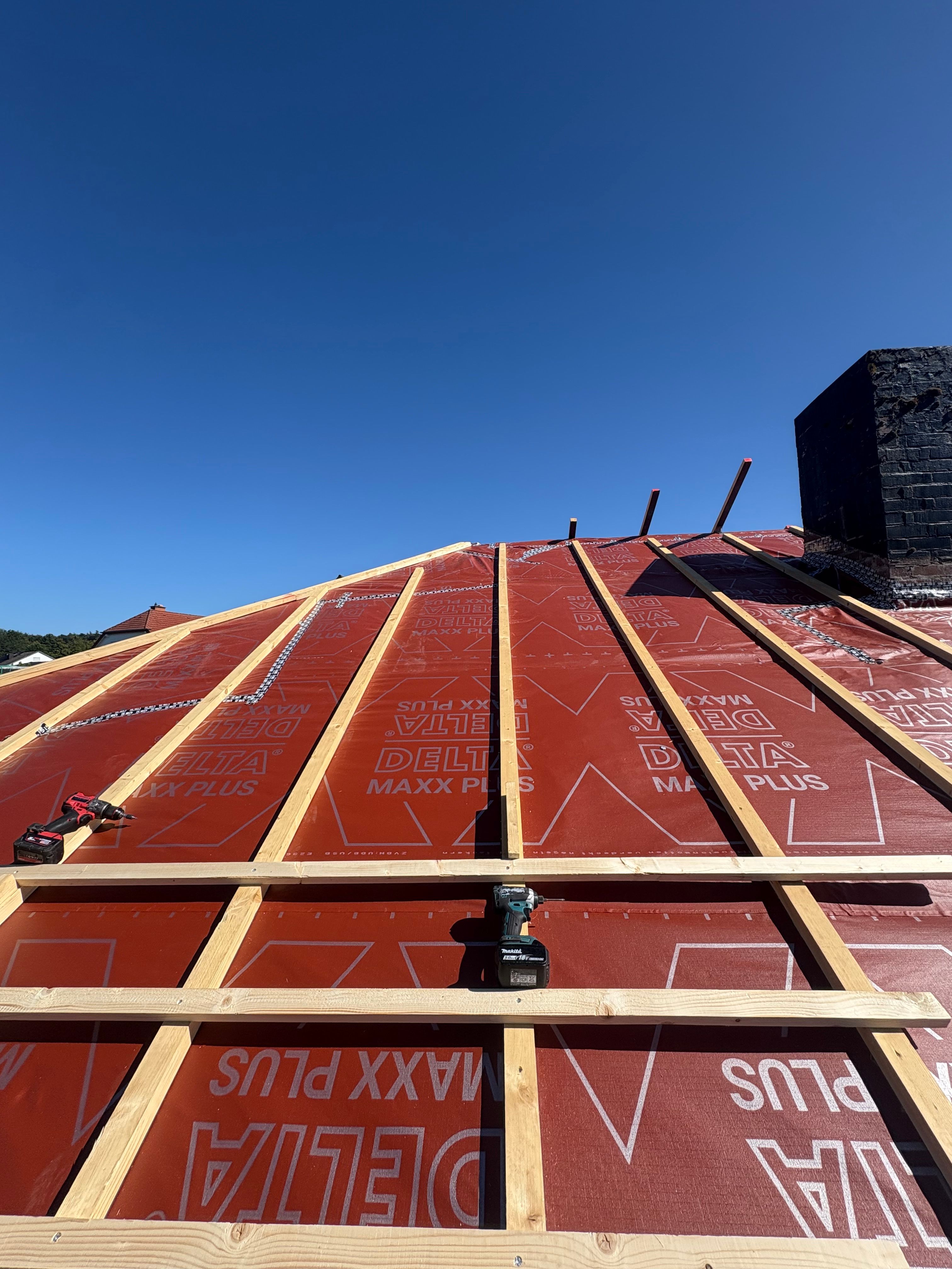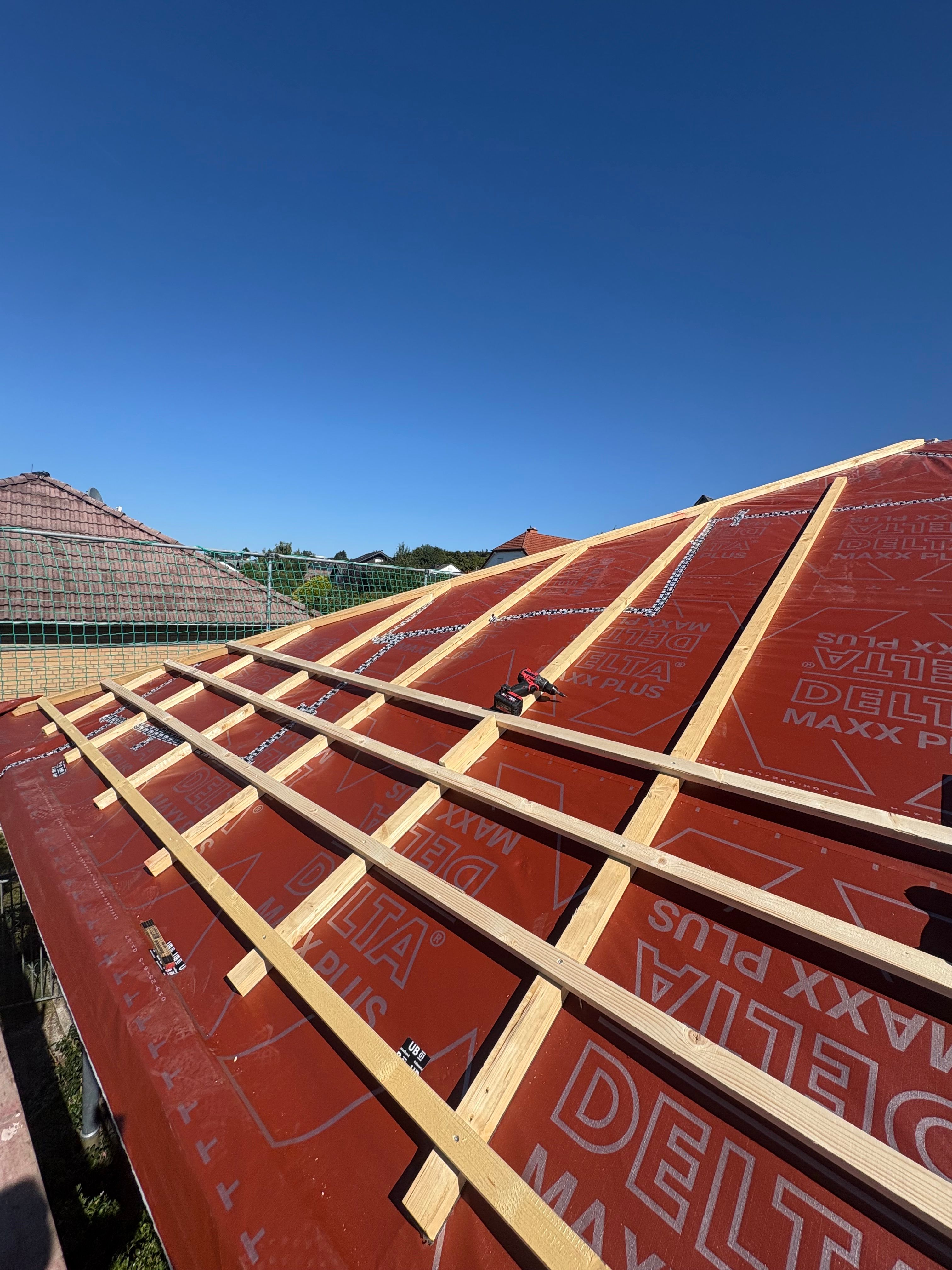 Danach kamen Konter- und Traglattung drauf. Wir richten die Lattung bewusst exakt aus, mit korrekten Abständen und sauberer Befestigung, damit die spätere Eindeckung gerade liegt und das Dach am Ende wie aus einem Guss wirkt. Genau so muss Vorarbeit aussehen – dann kann man oben drauf sauber eindecken.