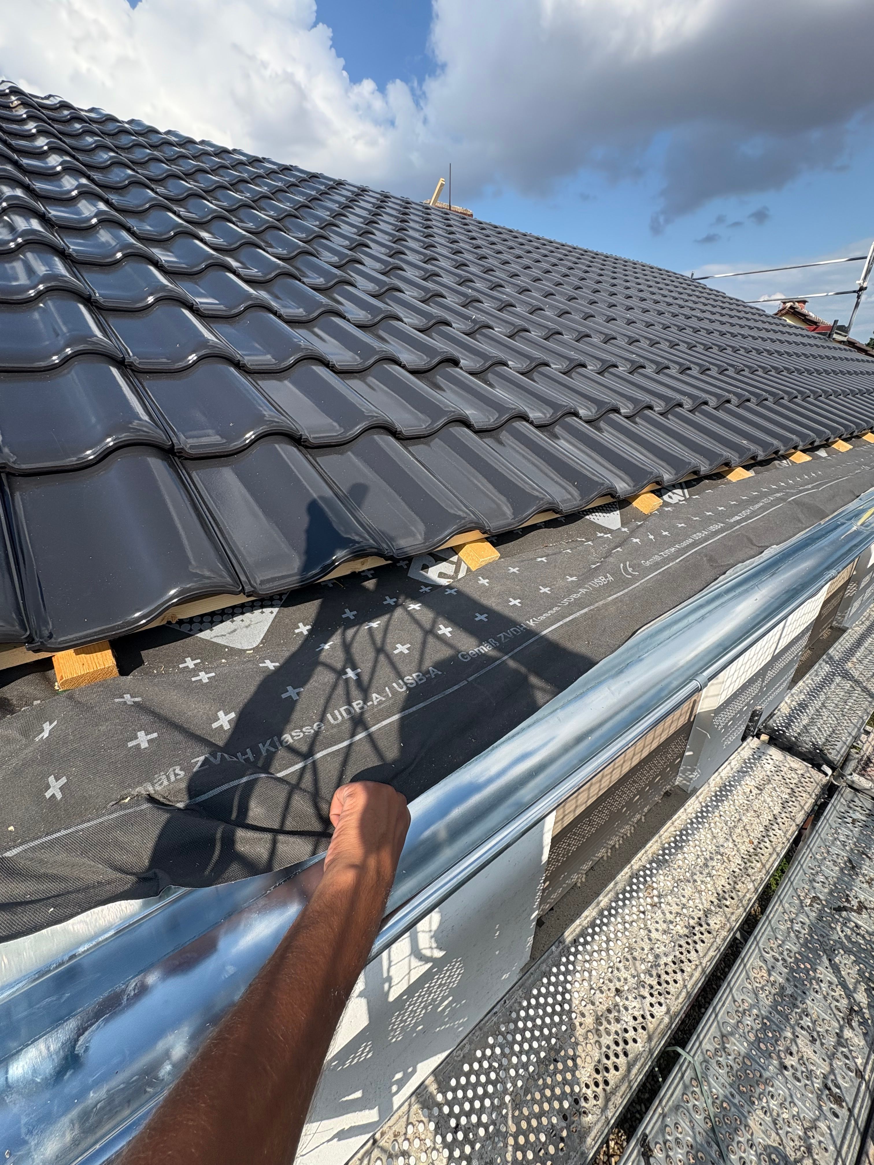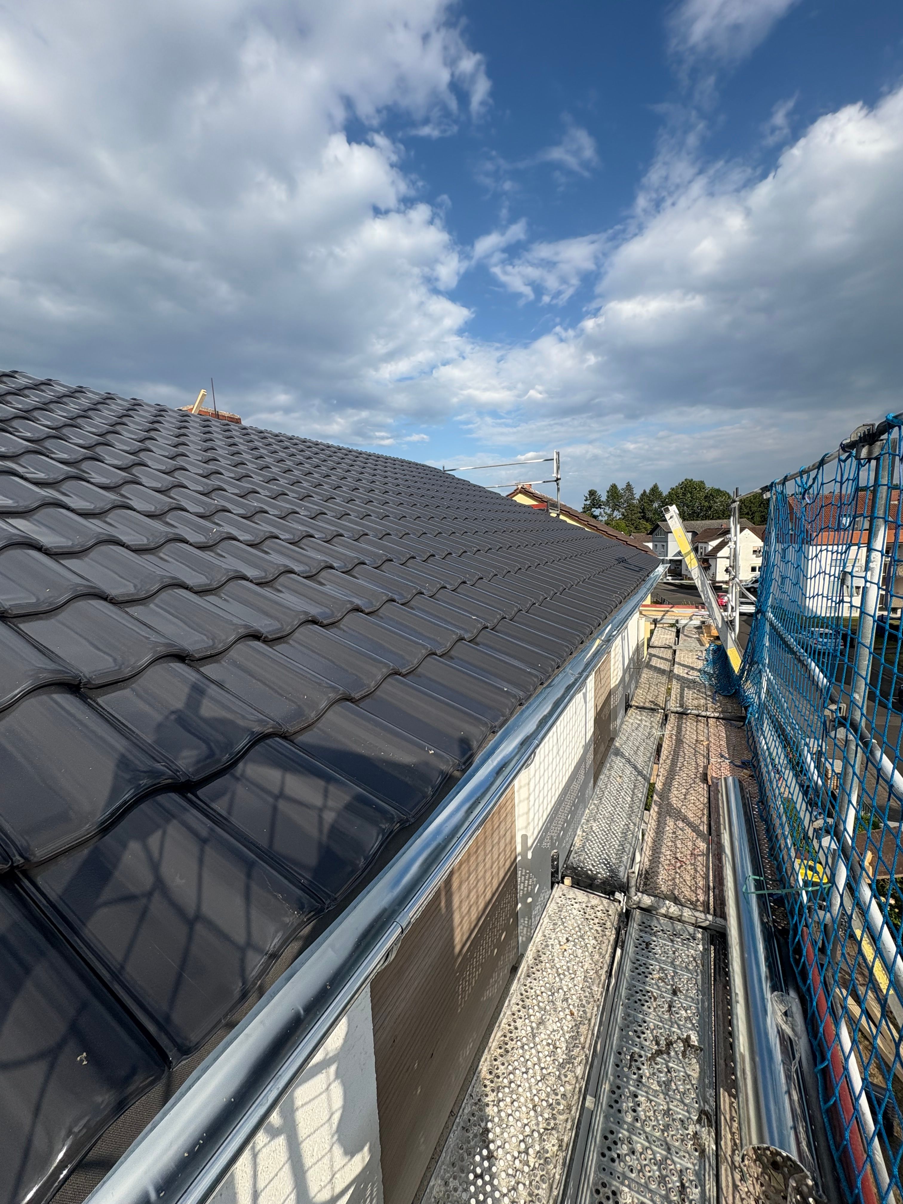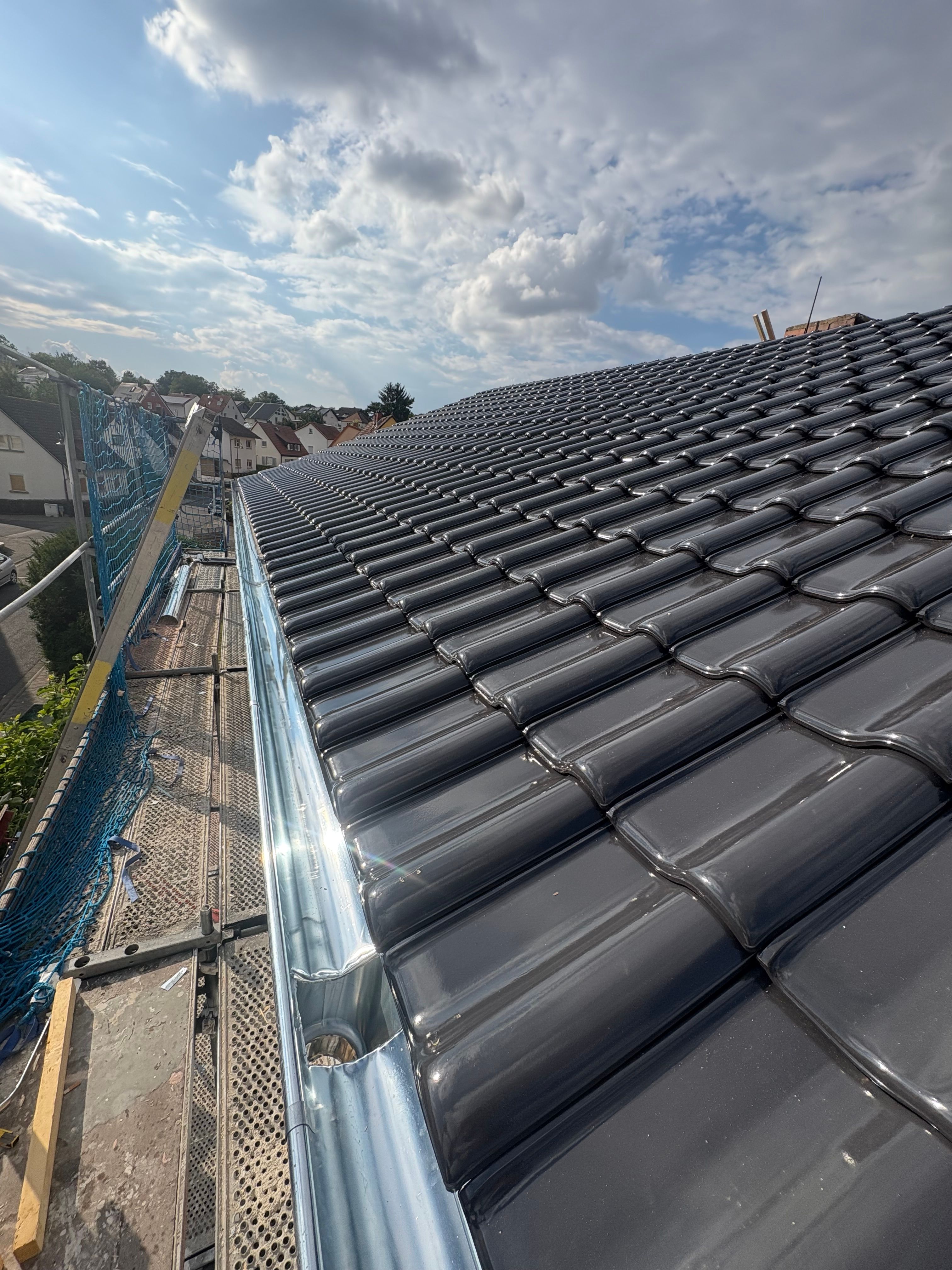 Zum Abschluss erfolgte die Neueindeckung mit hochwertigen Dachsteinen und die saubere Ausführung des Firstbereichs. Das Dach wirkt jetzt gleichmäßig, aufgeräumt und handwerklich korrekt. Eine ehrliche Dachsanierung, wie sie im Raum rund um Offenbach gebraucht wird – ordentlich gemacht und auf viele Jahre ausgelegt.