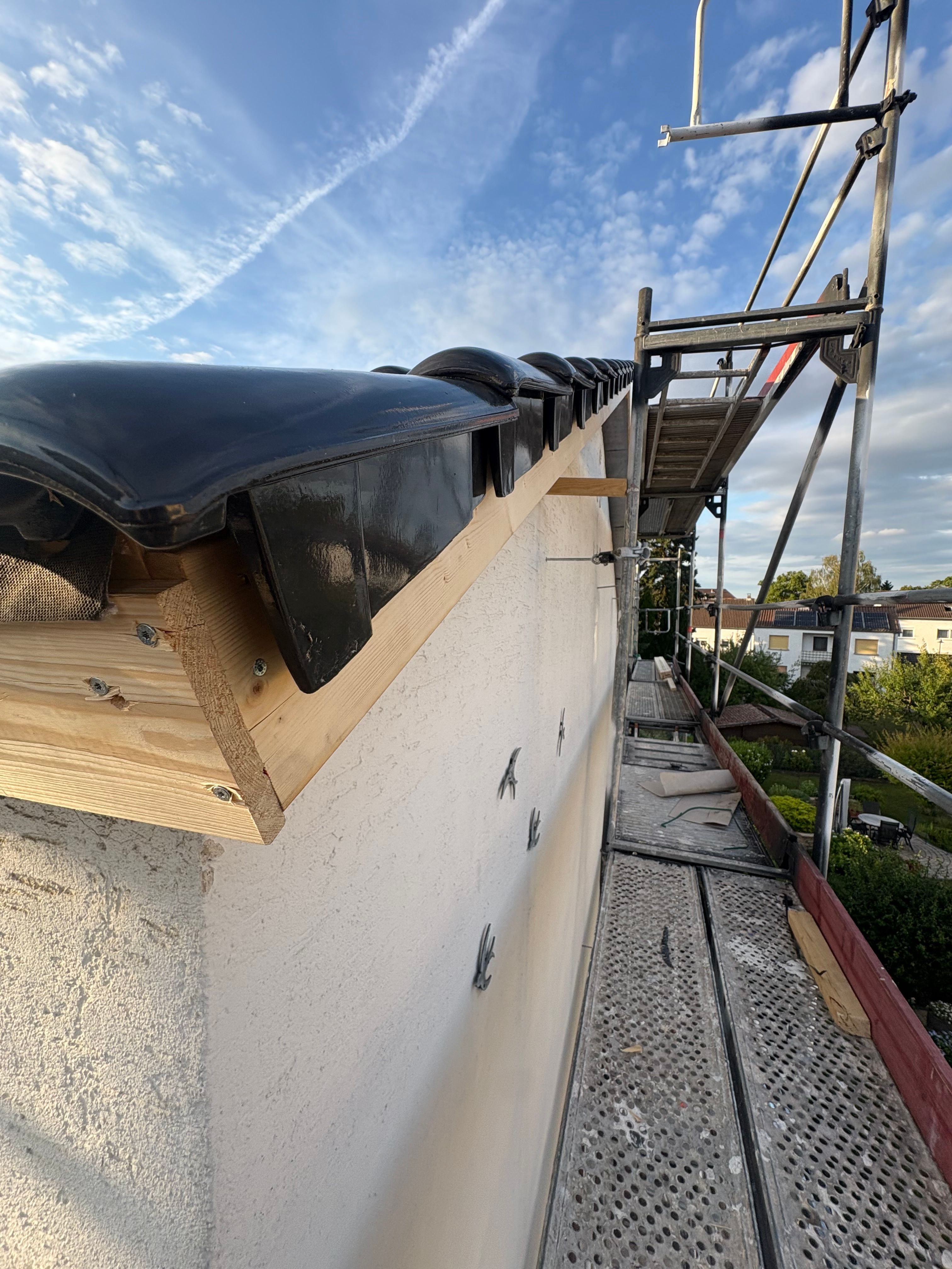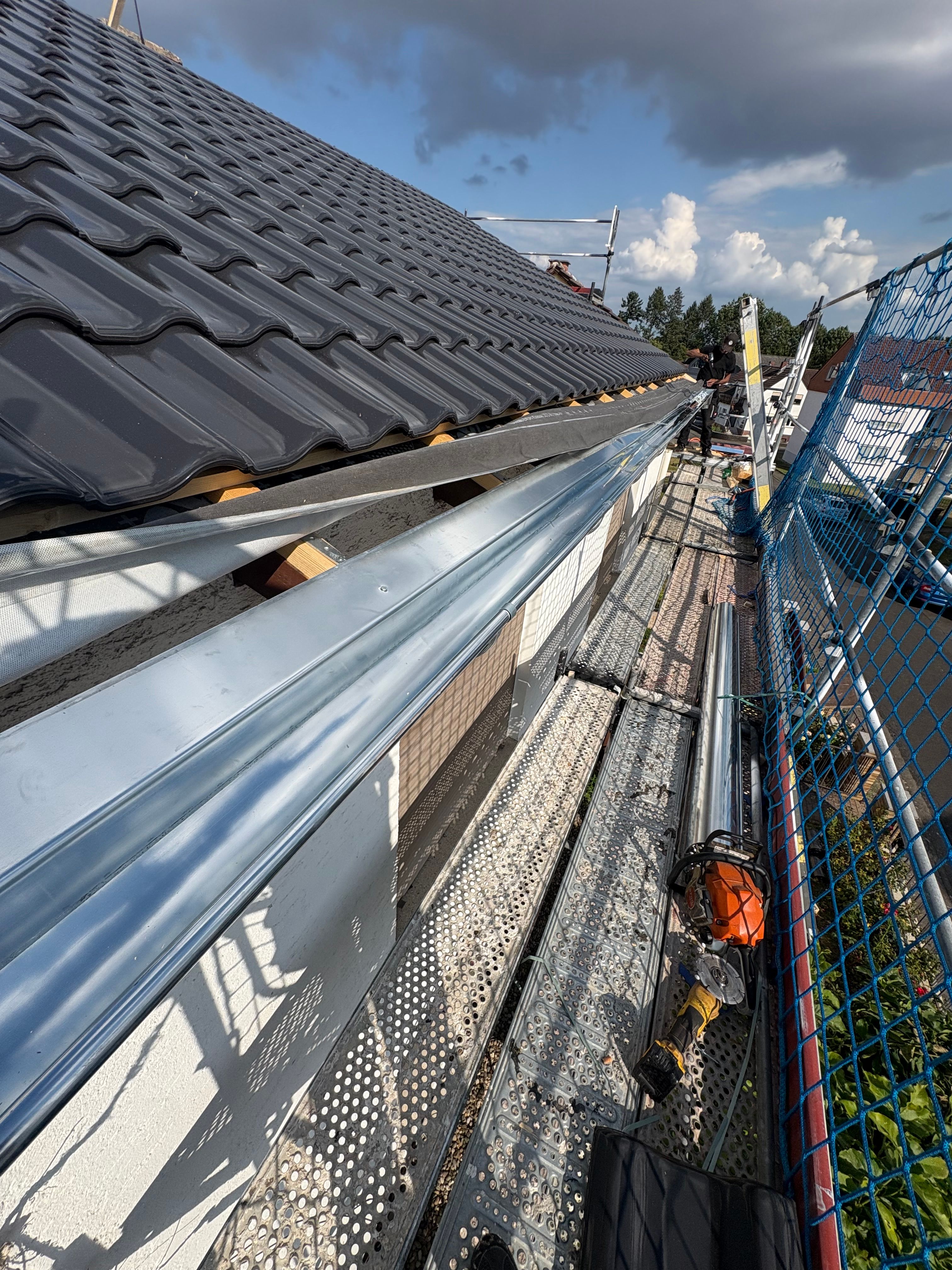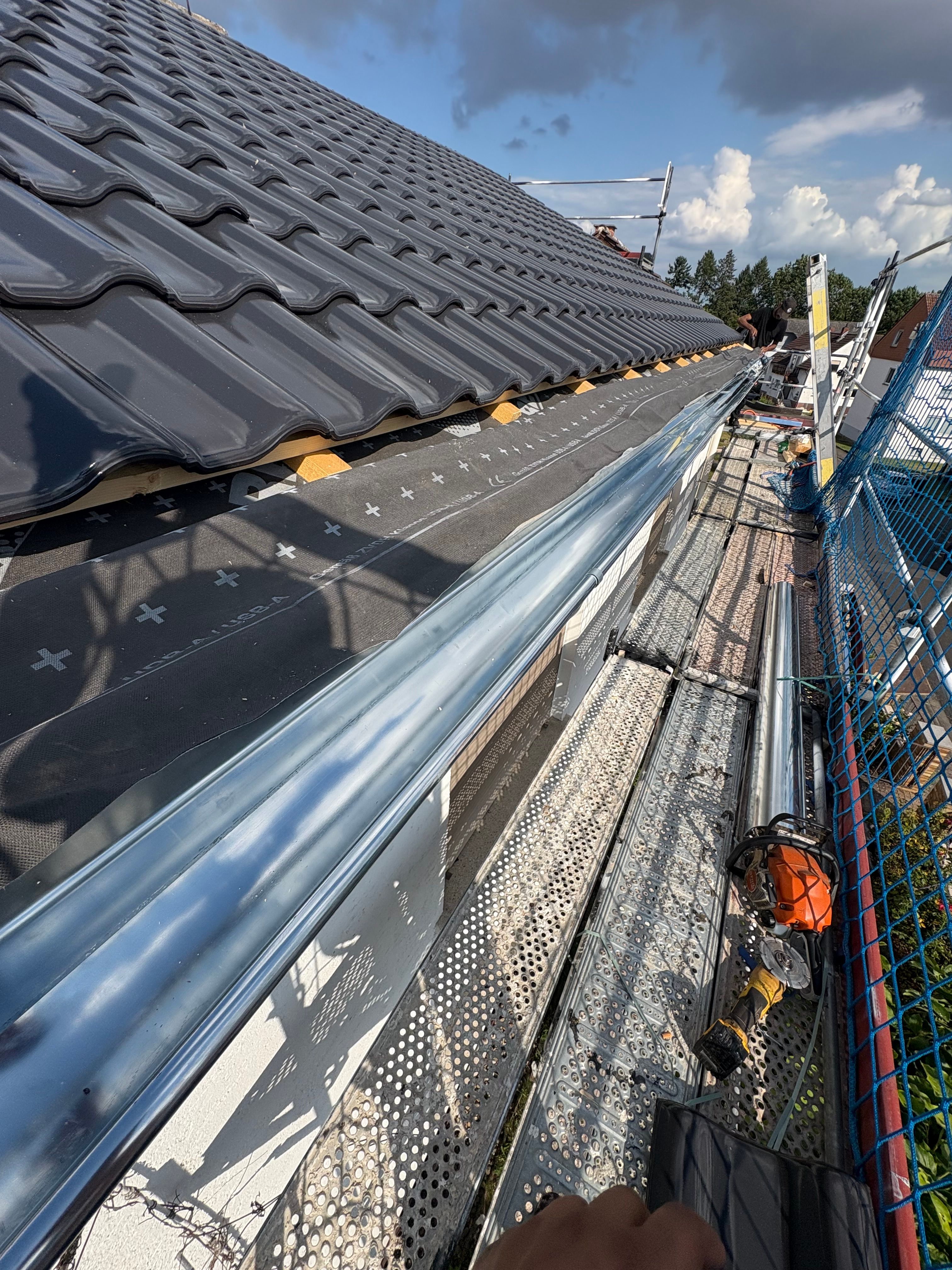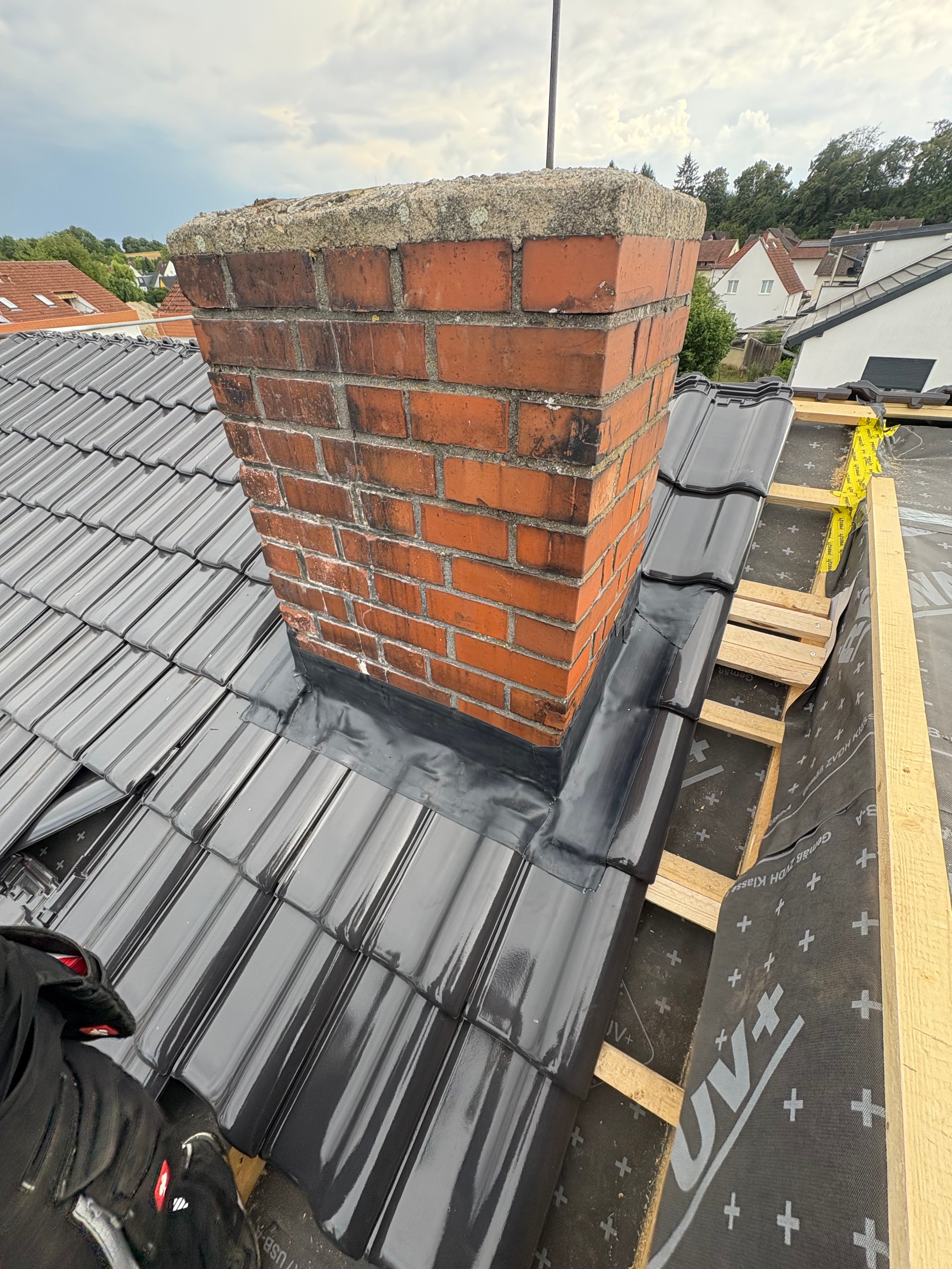 Im Anschluss haben wir die Unterspannbahn neu verlegt und die Konter- sowie Traglattung fachgerecht aufgebaut. Traufe und Ortgang wurden neu ausgeführt, die Dachentwässerung erneuert und sauber eingebunden. Der Schornstein wurde neu eingefasst und eingeblechtt, alle Anschlüsse und Durchdringungen exakt an den neuen Dachaufbau angepasst.